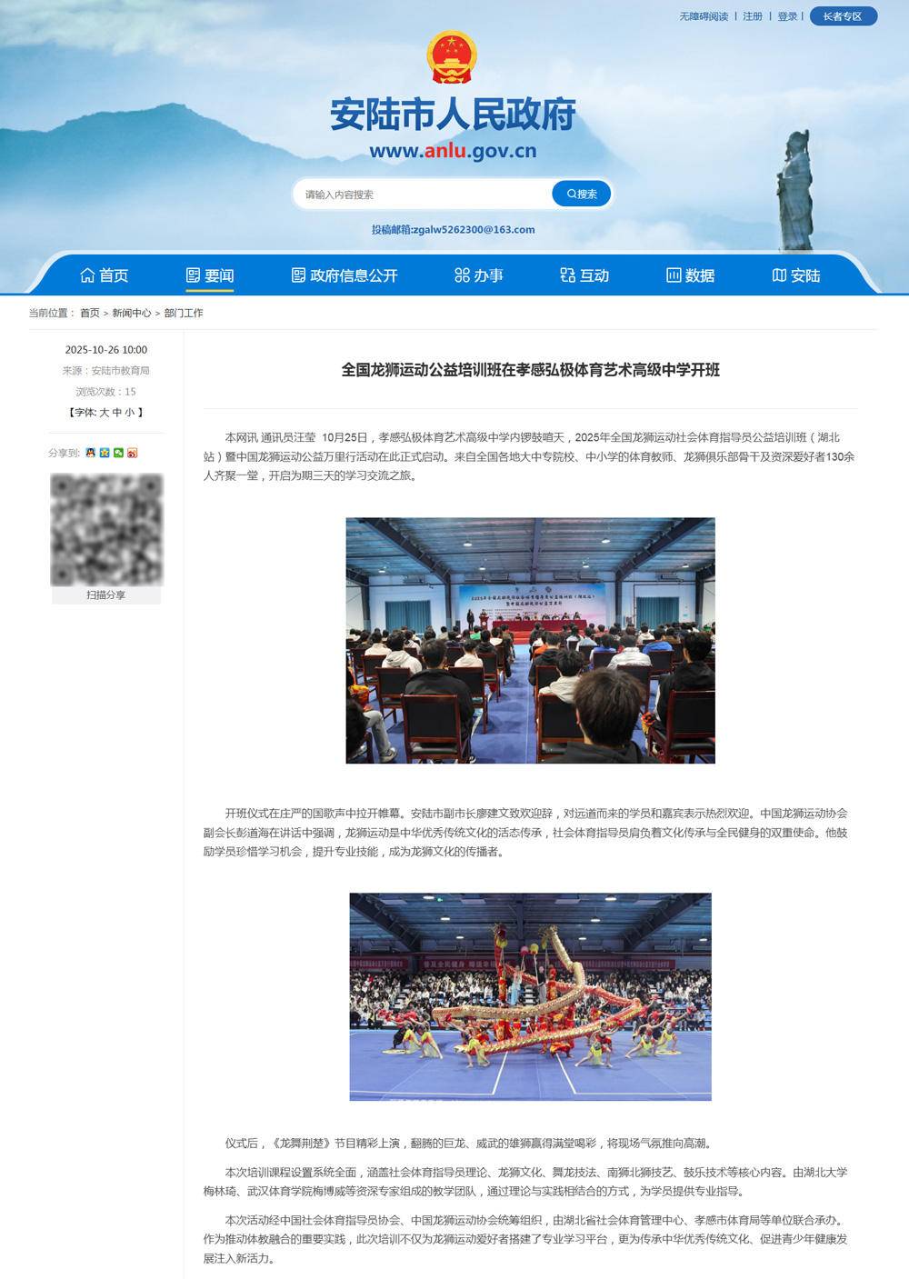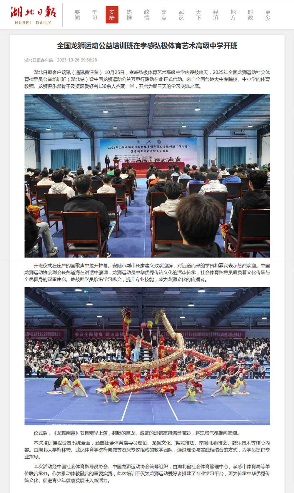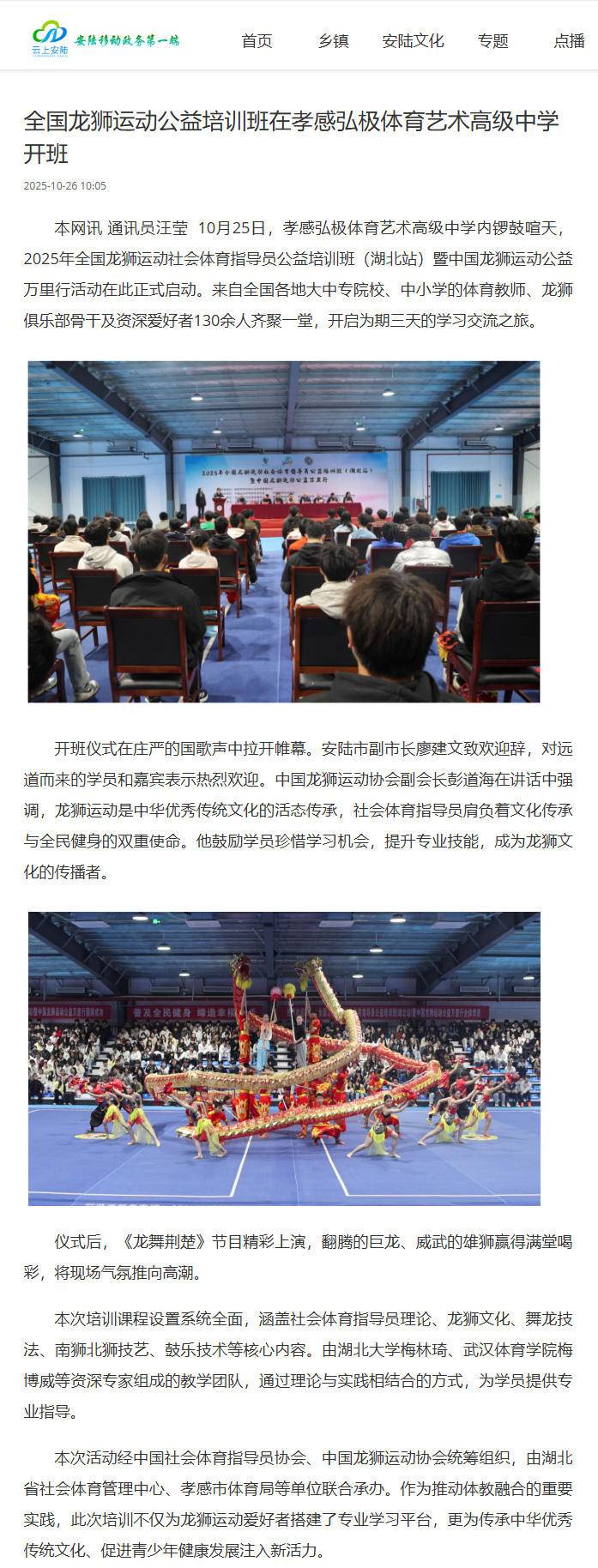 媒体链接:全国龙狮运动公益培训班在孝感弘极体育艺术高级中学开班 - 部门工作 - 安陆市人民政府